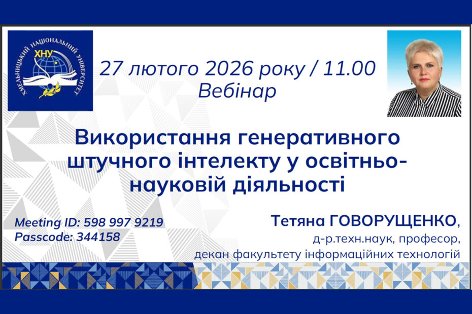 27 лютого 2026 року викладачі кафедри активно підключились до цікавезного заходу – вебінару ВИКОРИСТАННЯ ГЕНЕРАТИВНОГО… Читати далі »ВИКОРИСТАННЯ ГЕНЕРАТИВНОГО ШТУЧНОГО ІНТЕЛЕКТУ У ОСВІТНЬО-НАУКОВІЙ ДІЯЛЬНОСТІ