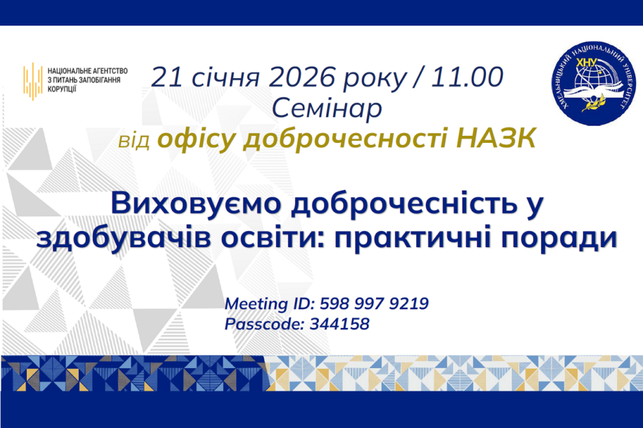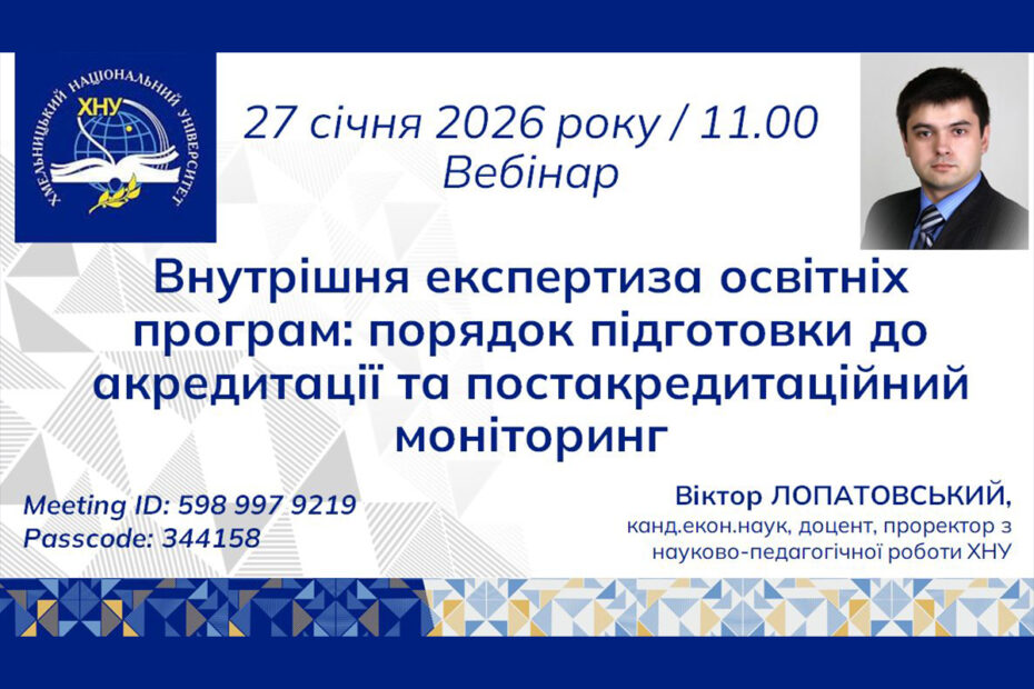 27 січня 2026 року викладачі кафедри взяли участь у вебінарі «Внутрішня експертиза освітніх програм: порядок… Читати далі »ВНУТРІШНЯ ЕКСПЕРТИЗА ОСВІТНІХ ПРОГРАМ: ПОРЯДОК ПІДГОТОВКИ ДО АКРЕДИТАЦІЇ ТА ПОСТАКРЕДИТАЦІЙНИЙ МОНІТОРИНГ