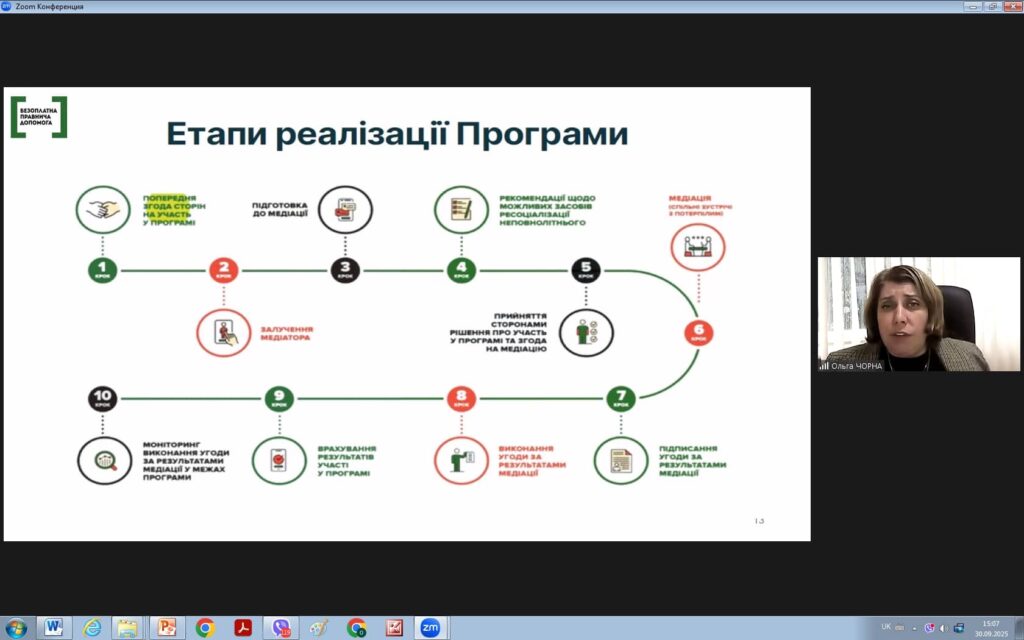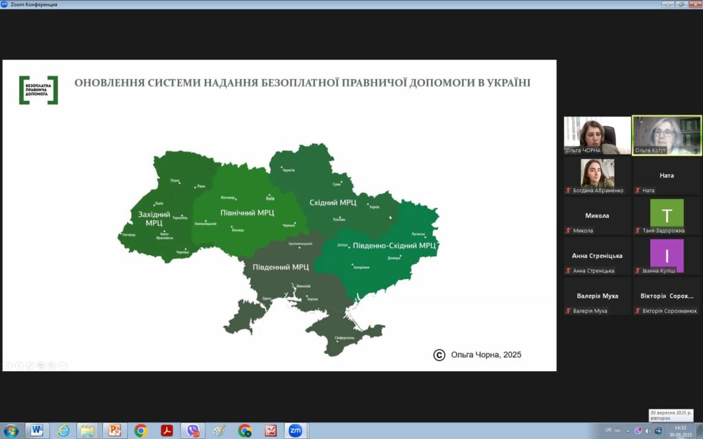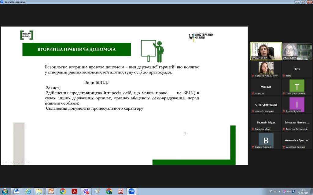 30 вересня 2025 року в рамках вивчення дисципліни «Засади та процедури судочинства: доктринальні та практичні аспекти» магістри спеціальності Право мали можливість прослухати гостьову лекцію «Безоплатна правнича допомога». Лектор – Ольга ЧОРНА – юристка, медіаторка, начальниця управління організації надання безоплатної вторинної правничої допомоги та проведення медіації Північного міжрегіонального центру з надання безоплатної правничої допомоги.