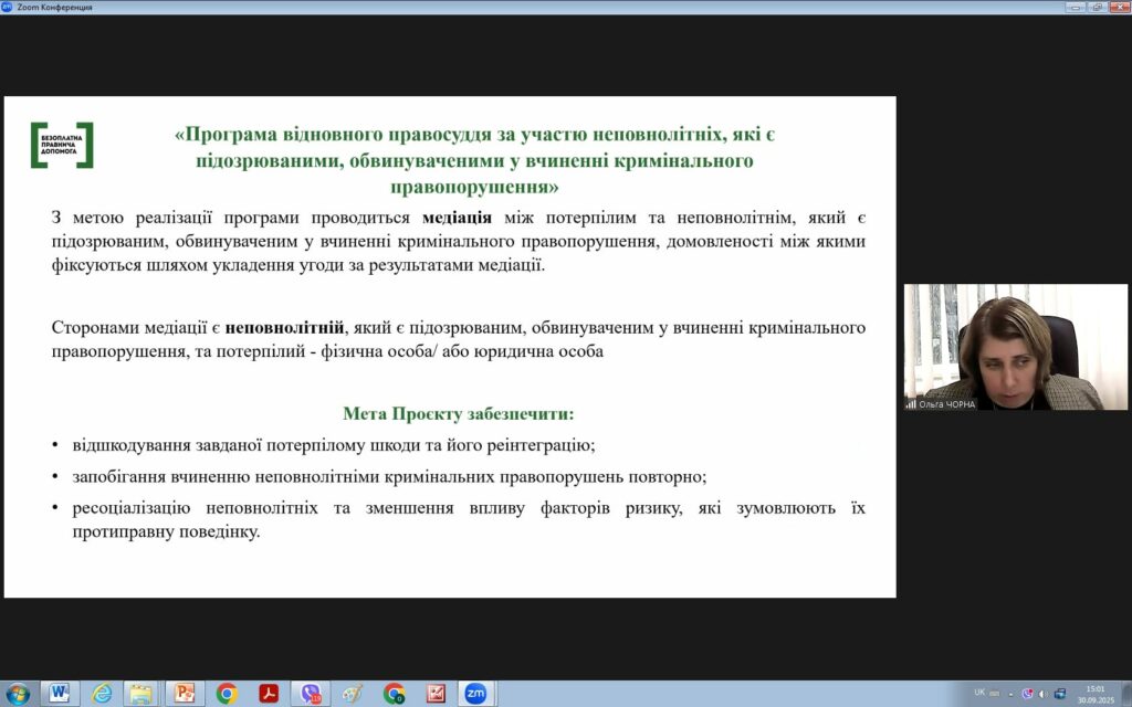 Також лектор зупинилась на висвітлення мети та змісту пілотного проекту «Програма відновного правосуддя за участю неповнолітніх, які є підозрюваними, обвинуваченими у вчиненні кримінального правосуддя».