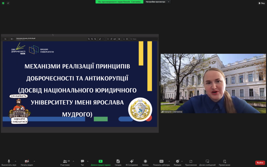 12 березня 2026 року викладачі кафедри Ольга КОГУТ та Ольга ОХМАН взяли участь в онлайн-зустрічі «Доброчесність у закладах вищої освіти: практики та досвід», організатором якої виступив Офіс доброчесності НАЗК. Під час заходу учасники мали можливість ознайомитись з реальними прикладами інтеграції теми доброчесності у навчальний та науковий процес, дізнатись про перевірені підходи та механізми запобігання недоброчесній поведінці.