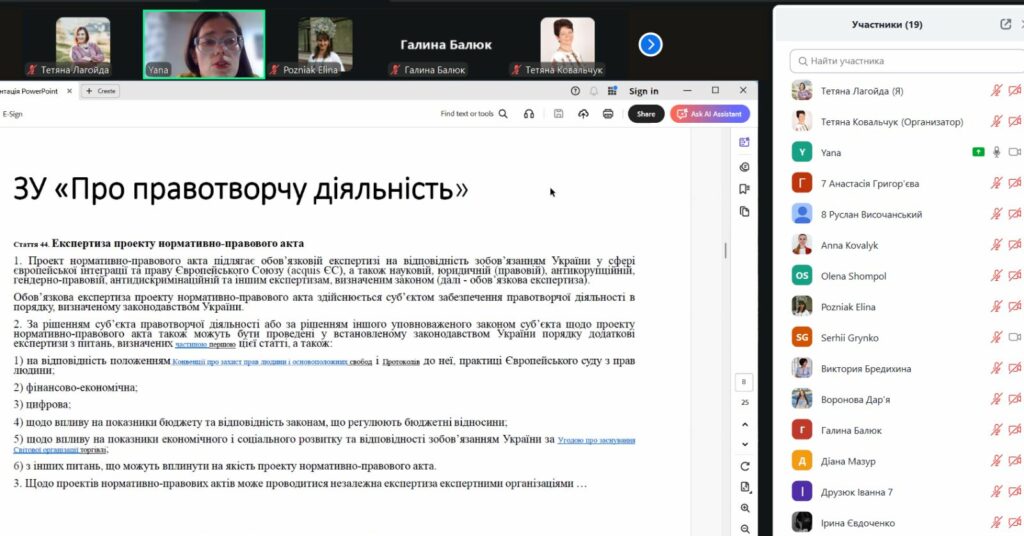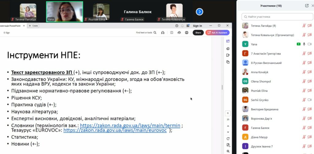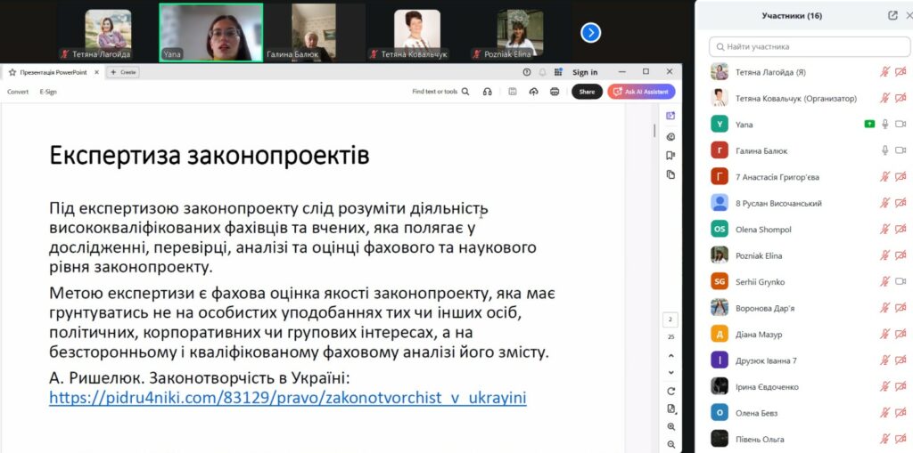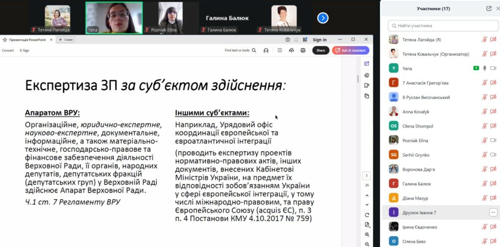 16 жовтня 2025 року доцент кафедри права Хмельницького національного університету Лагойда Т.В. доєдналась до наукового діалогу на кафедрі екологічного права ННІ права КНУ імені Тараса Шевченка на тему «Експертиза законопроєктів у сфері екології: на прикладі діяльності Верховної Ради України».