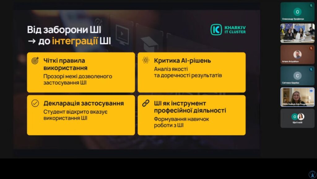 – Академічна доброчесність у добу штучного інтелекту: від контролю до переосмислення навчання. Доповідач: Олена ДУДНИК – к.е.н, доцент, координатор освітніх програм Харківського ІТ кластеру