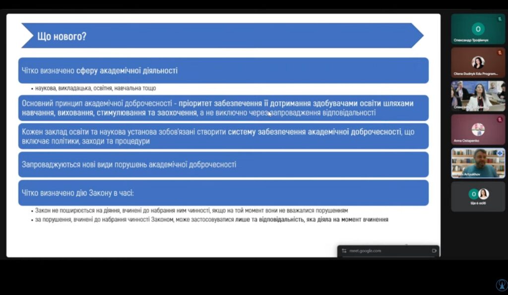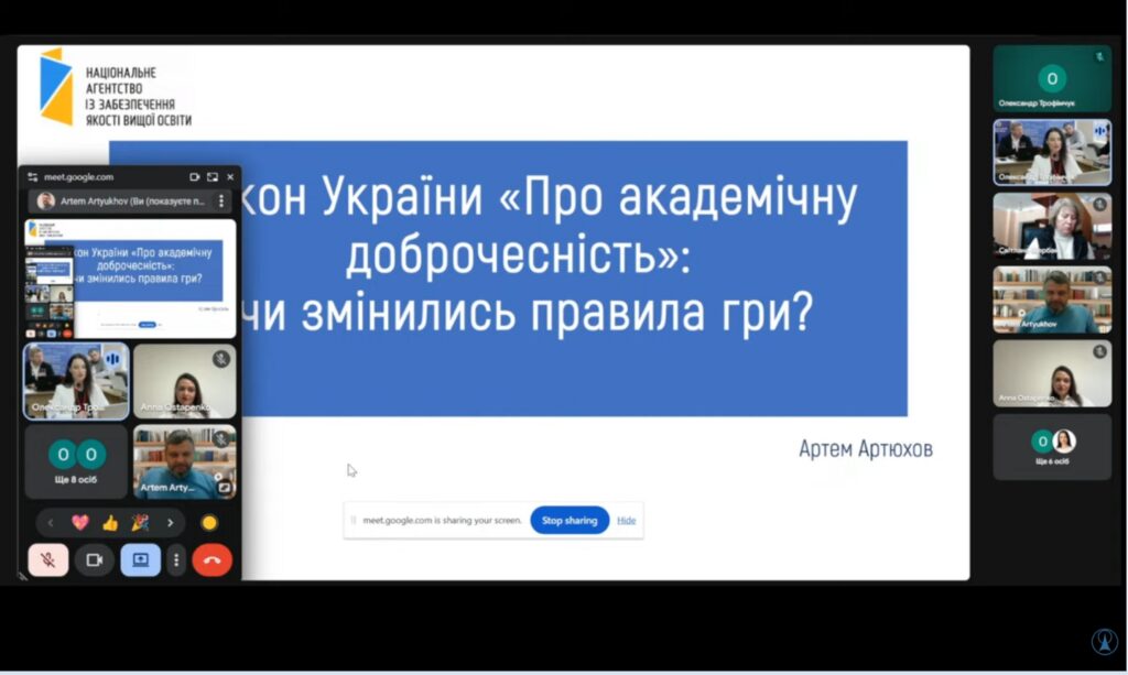 Заключним етапом заходу стала Панельна дискусія: Визначення ефективних підходів для забезпечення академічної доброчесності в освітній діяльності за сучасних умов, на якій було надано відповіді на найпоширеніші питання слухачів.