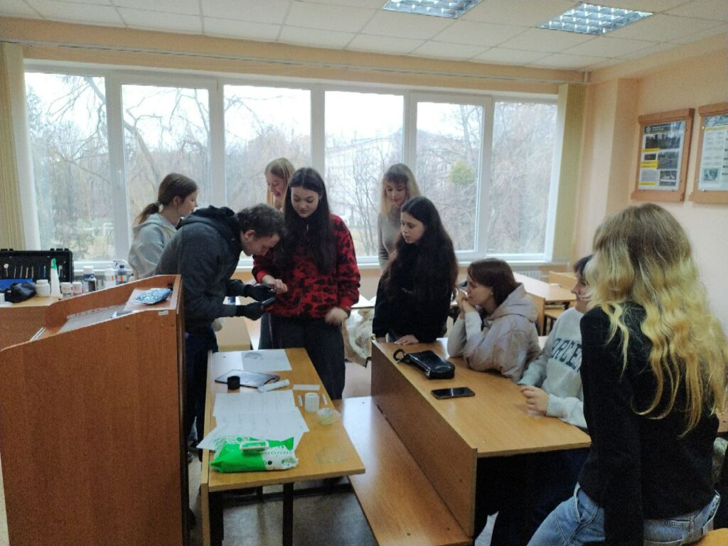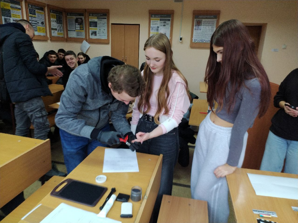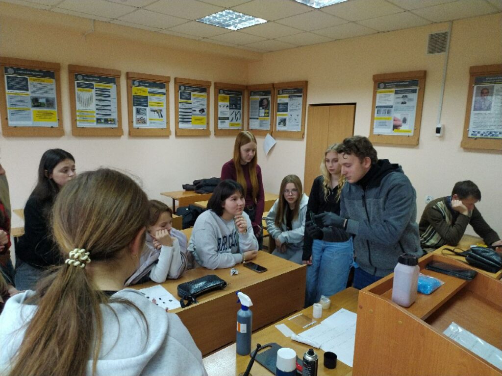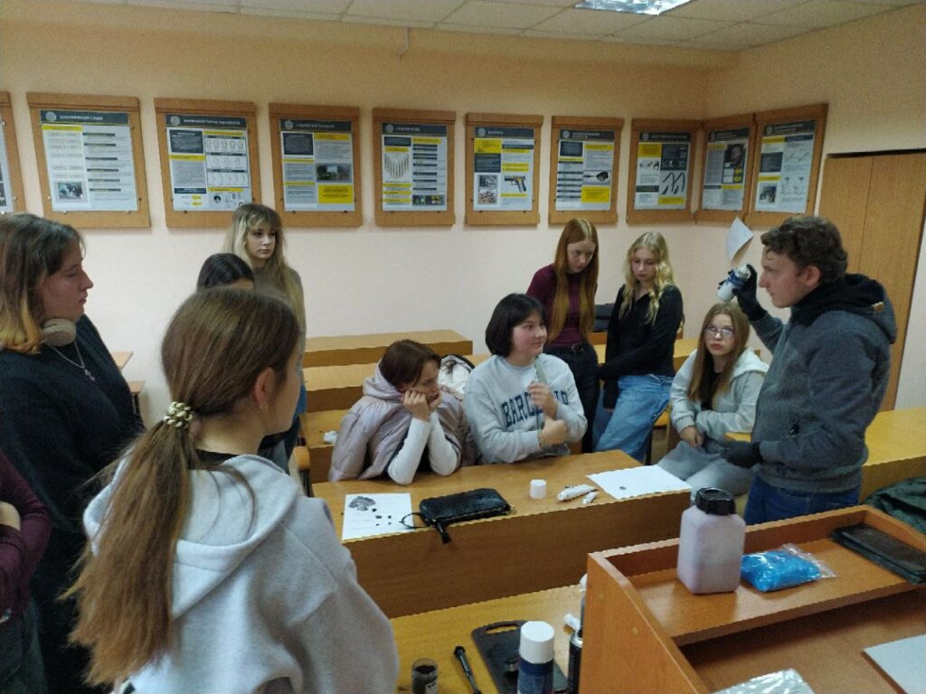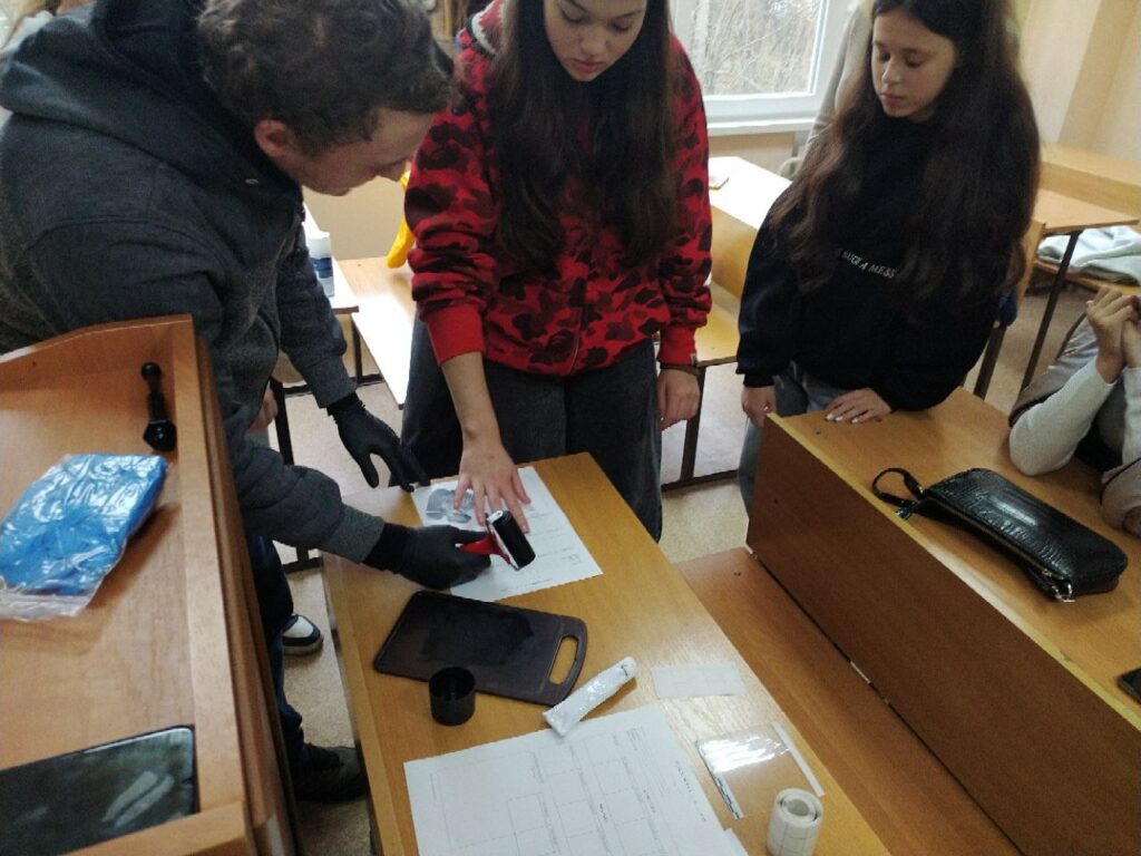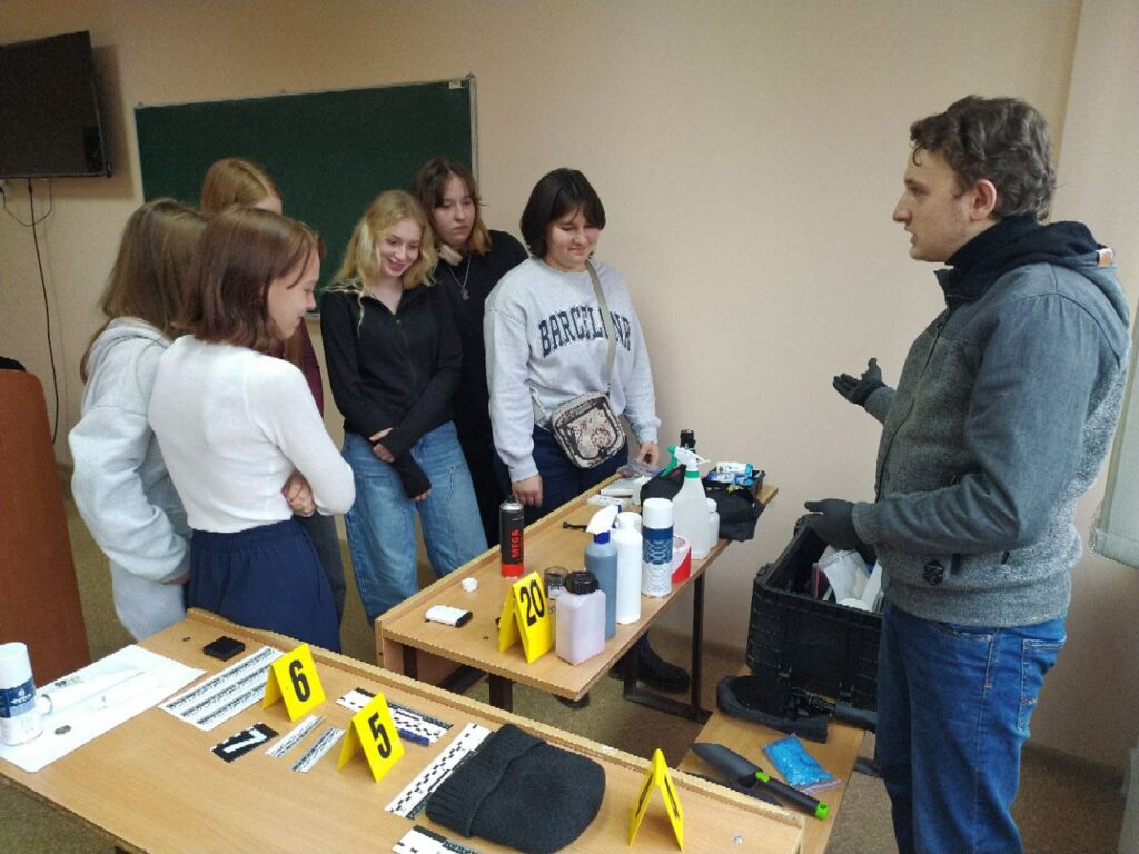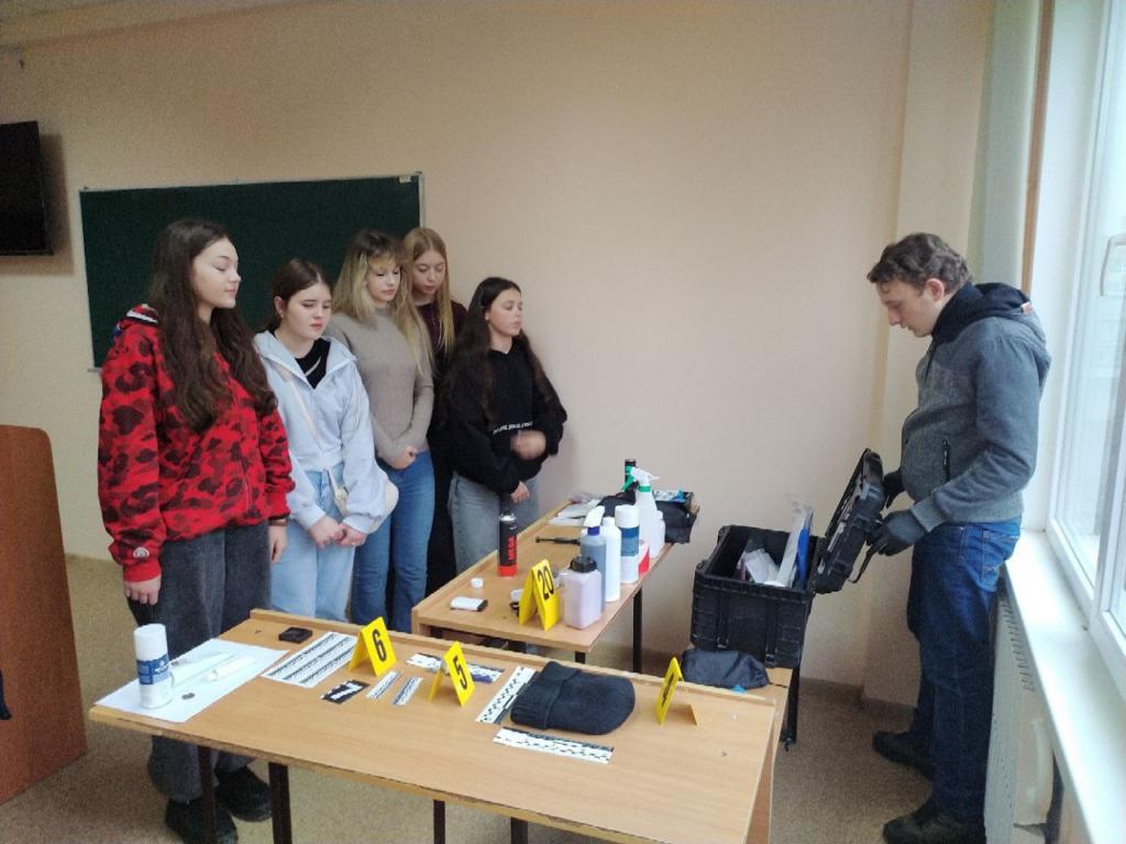 Після цього практичну частину заходу провели студенти третього курсу Володимир ВДОВІН та Єгор НЕСТЕРУК. Вони коротко ознайомили присутніх із криміналістикою як галуззю юридичної науки, продемонстрували криміналістичний набір та пояснили його призначення. У межах майстер-класу було проведено демонстрацію окремих елементів криміналістичного набору, зокрема дактилоскопічного магнітного та немагнітного порошку, різноманітних криміналістичних реагентів, а також процесу відкатування відбитків пальців для оформлення дактилоскопічних карток.