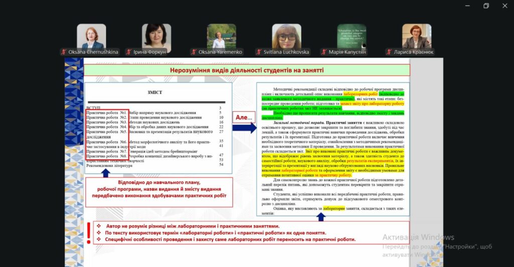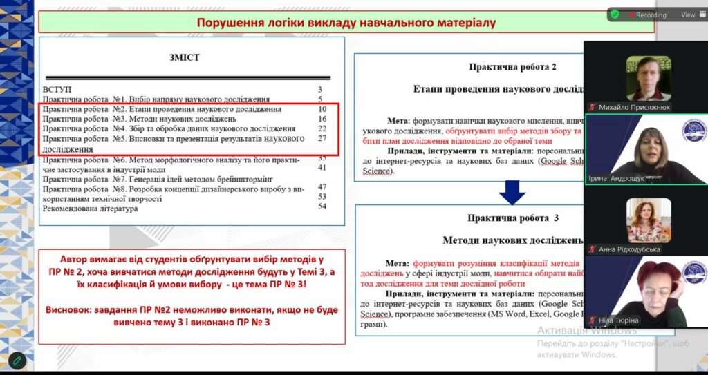 Модератором заходу виступила Ірина АНДРОЩУК, яка нагадала присутнім про основні внутрішні документи ХНУ, які регламентують вимоги до навчально-методичних видань, а також зупинилась на вимогах до правильного формулювання мети дисципліни, завдань і результатів навчання та інших проблемних аспектах, які виникають при написанні та правильному оформленні навчально-методичних видань.