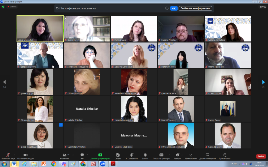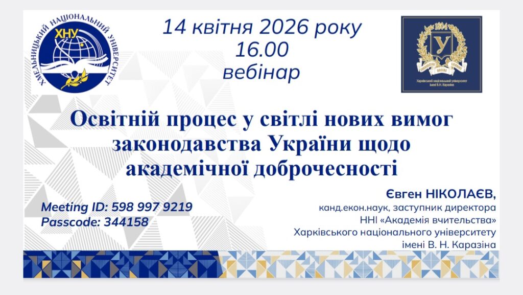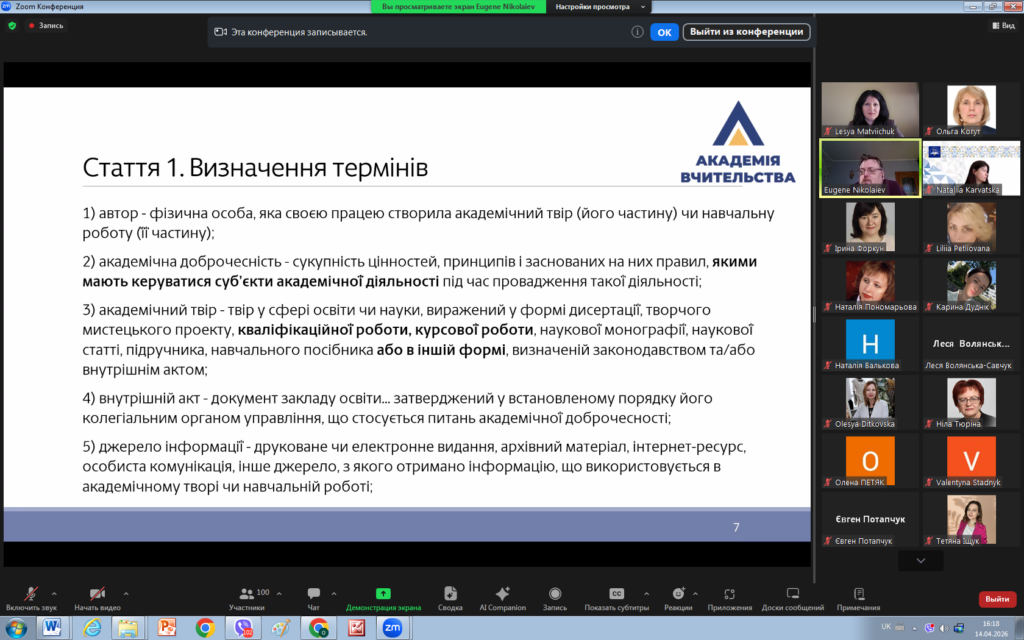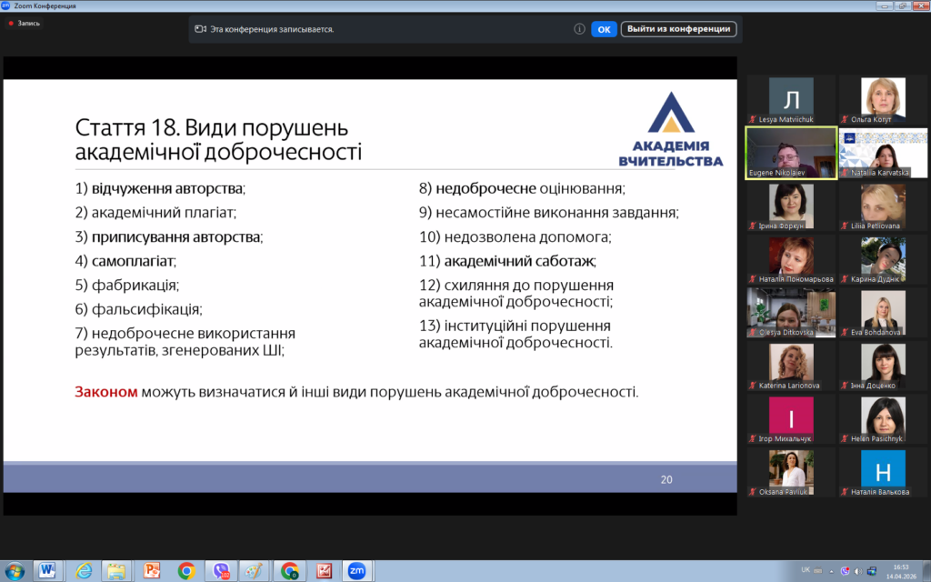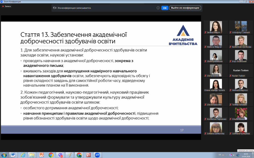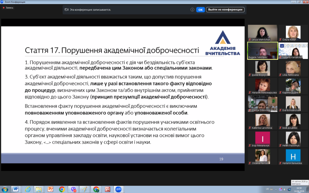 14 квітня 2026 року викладачі кафедри права взяли участь у вебінарі «Освітній процес у світлі нових вимог законодавства України щодо академічної доброчесності».