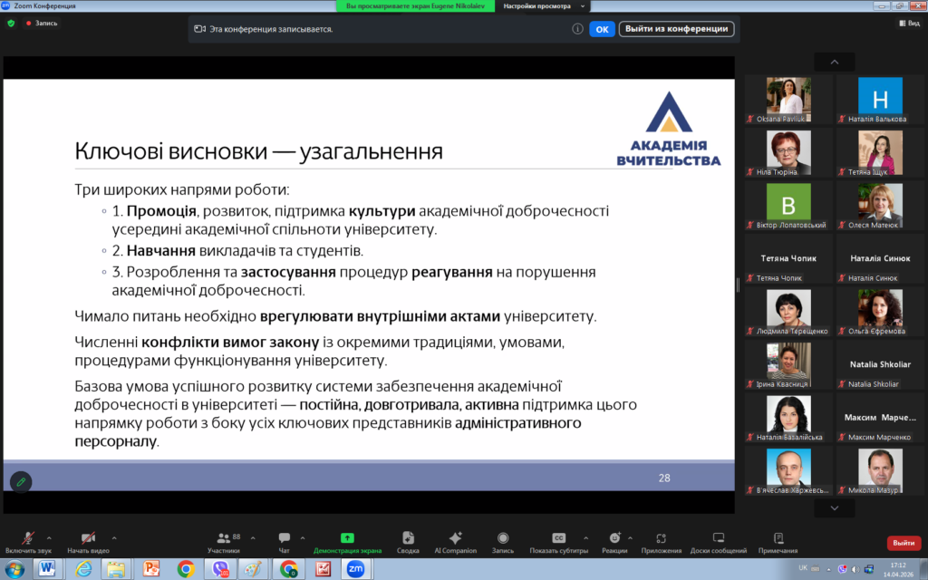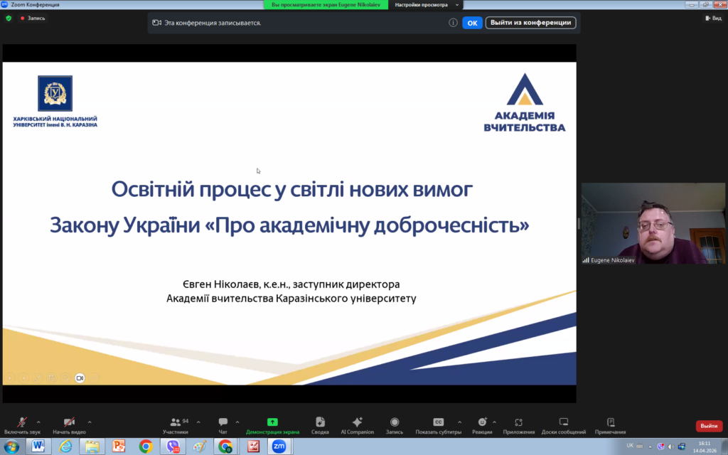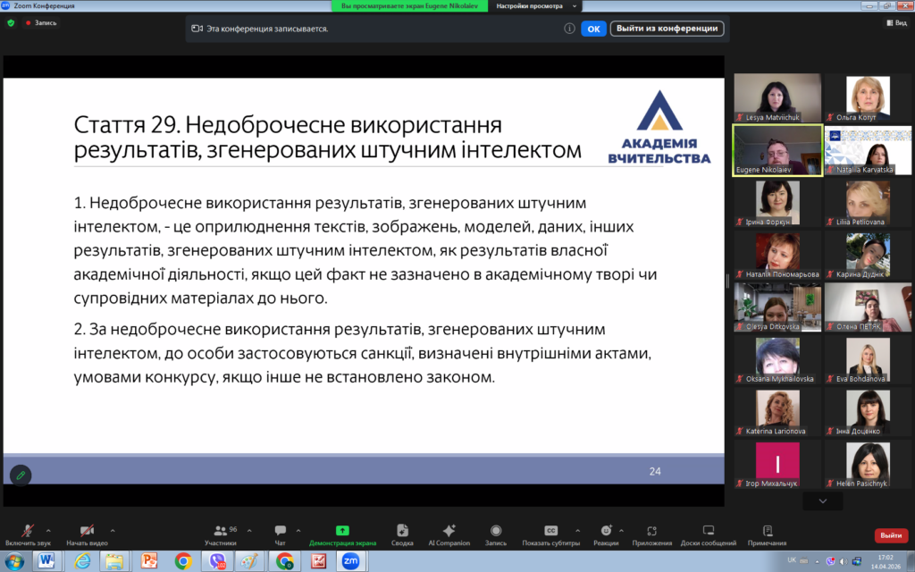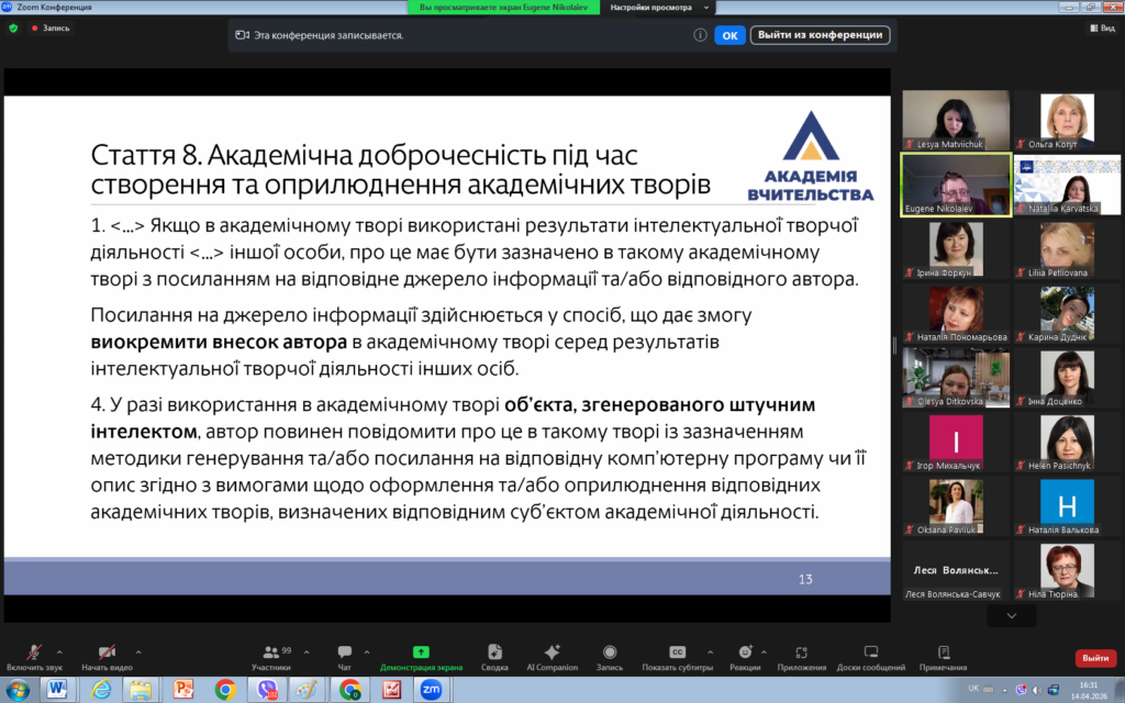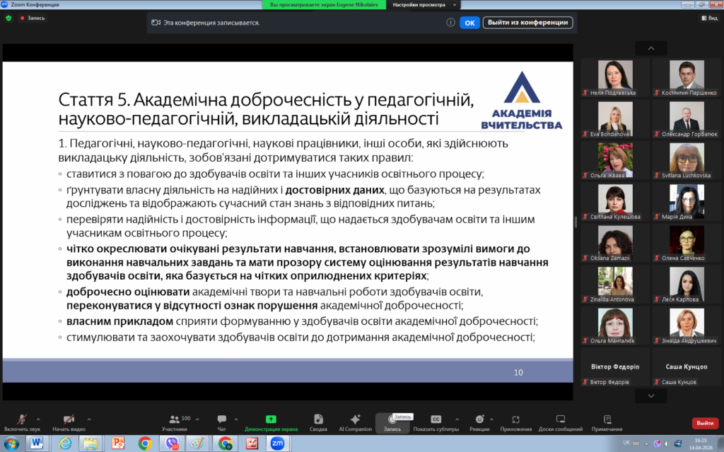 14 квітня 2026 року викладачі кафедри права взяли участь у вебінарі «Освітній процес у світлі нових вимог законодавства України щодо академічної доброчесності».