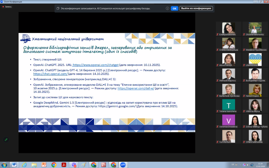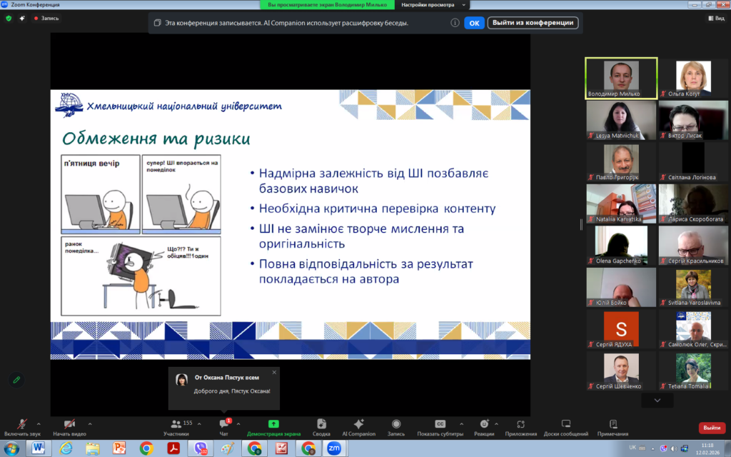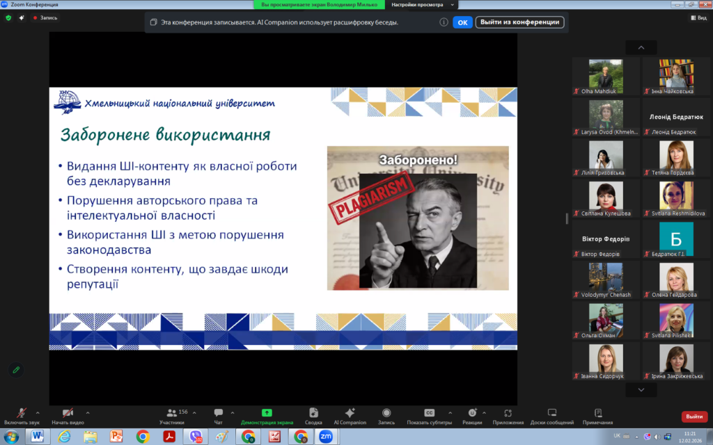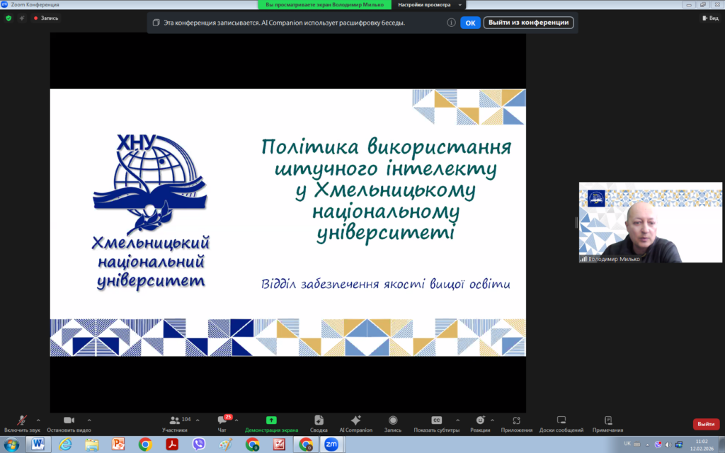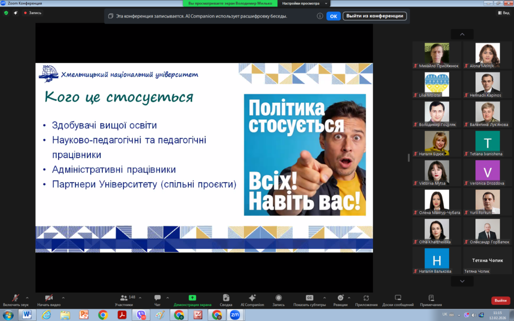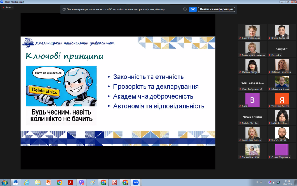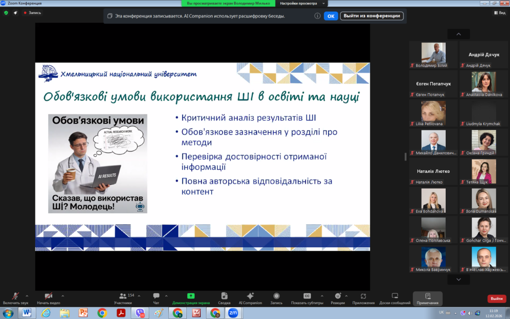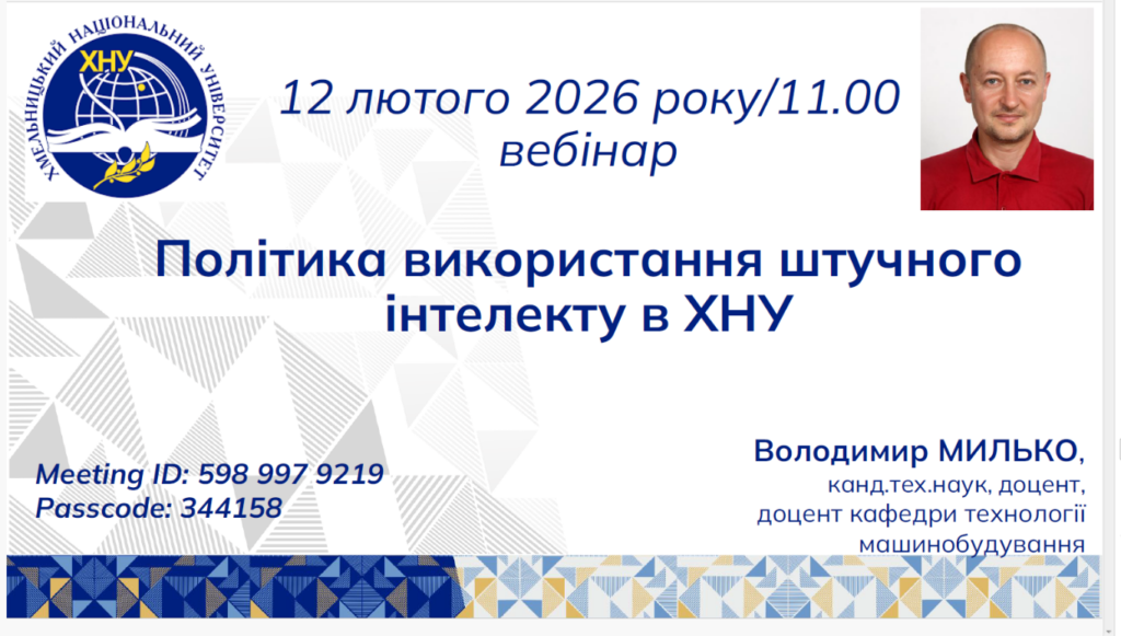 12 лютого 2026 року викладачі кафедри права взяли участь у вебінарі ПОЛІТИКА ВИКОРИСТАННЯ ШТУЧНОГО ІНТЕЛЕКТУ В ХНУ. Модератором заходу виступив кандидат технічних наук, доцент. доцент кафедри технології машинобудування Володимир МИЛЬКО.