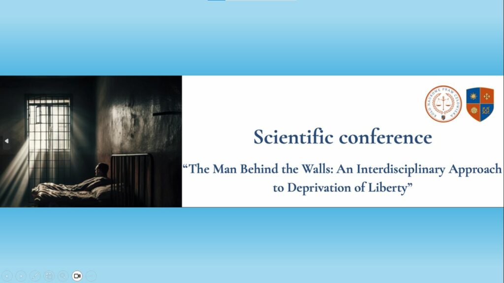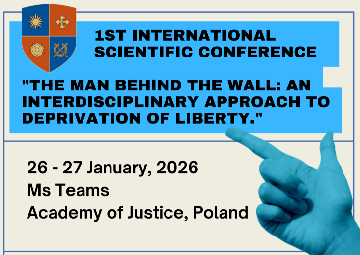 26-27 січня 2026 року відбулася Перша міжнародна наукова конференція «Людина за стіною: міждисциплінарний підхід до позбавлення волі»  (1st International Scientific Conference “The Man Behind the Wall: An Interdisciplinary Approach to Deprivation of Liberty”), організована Академією справедливості (Республіка Польща). Захід проходив у змішаному форматі: перший день — очно на базі Академії юстиції в місті Каліш, другий — дистанційно на платформі MS Teams.