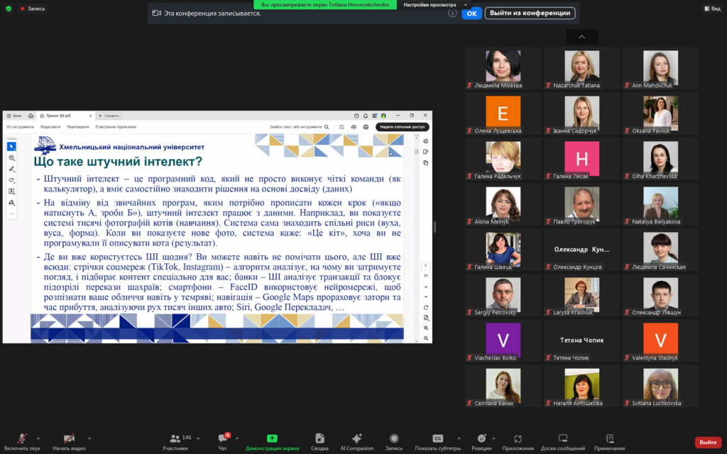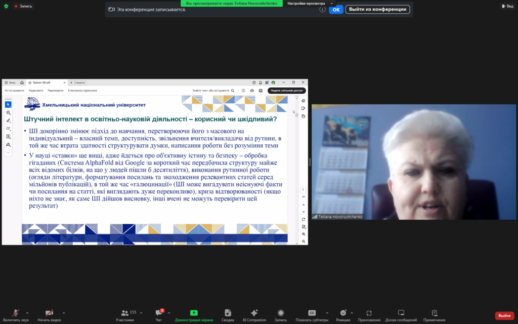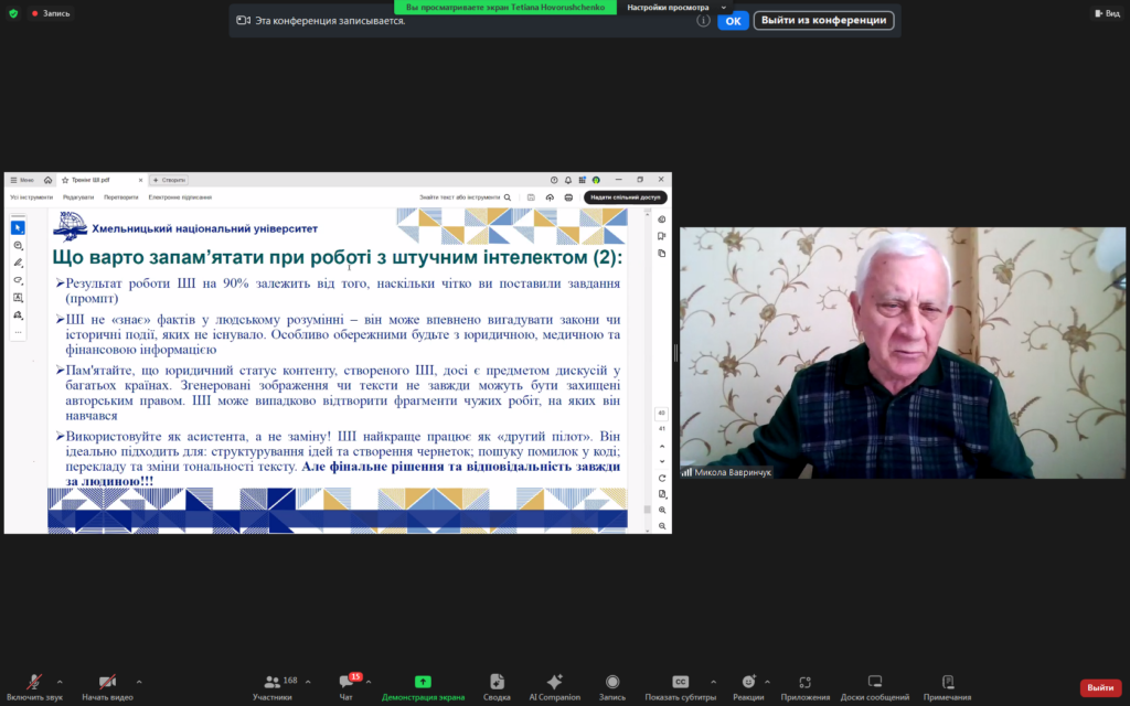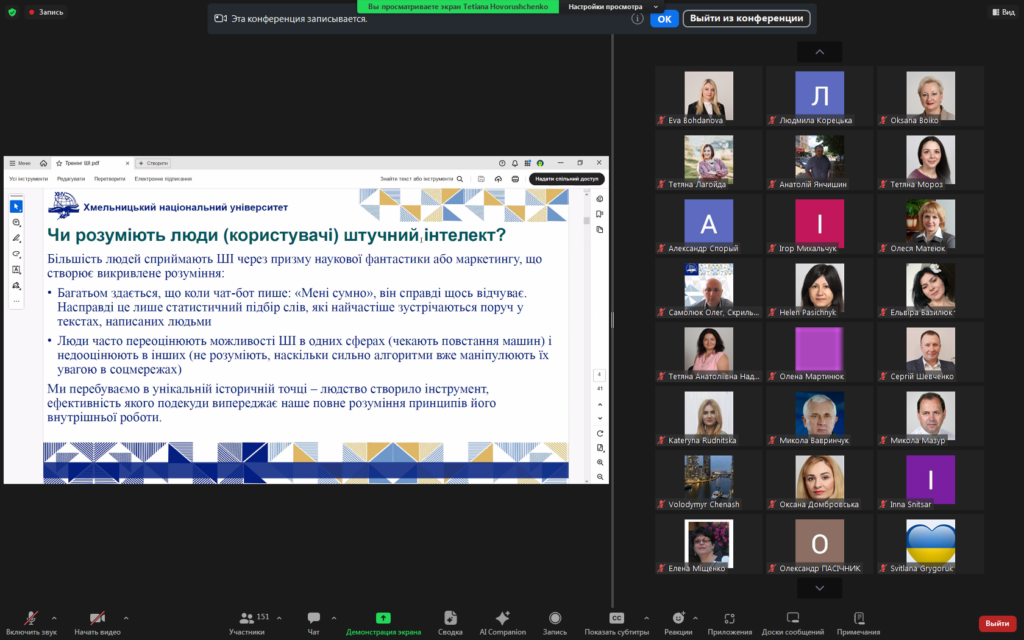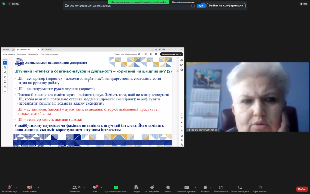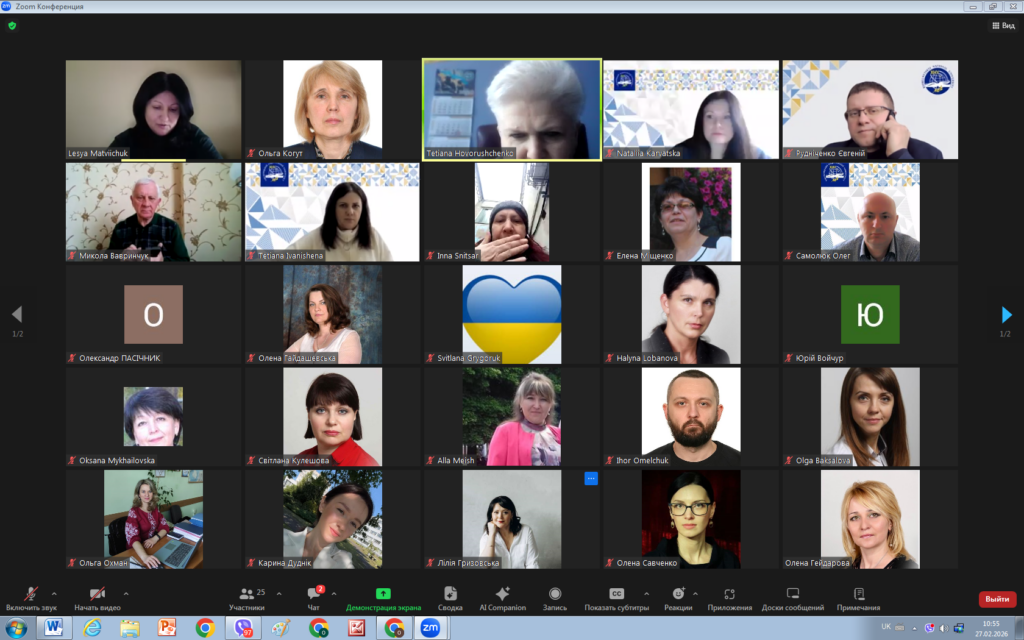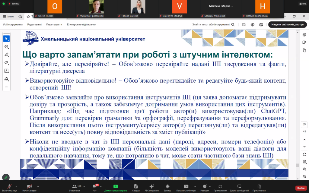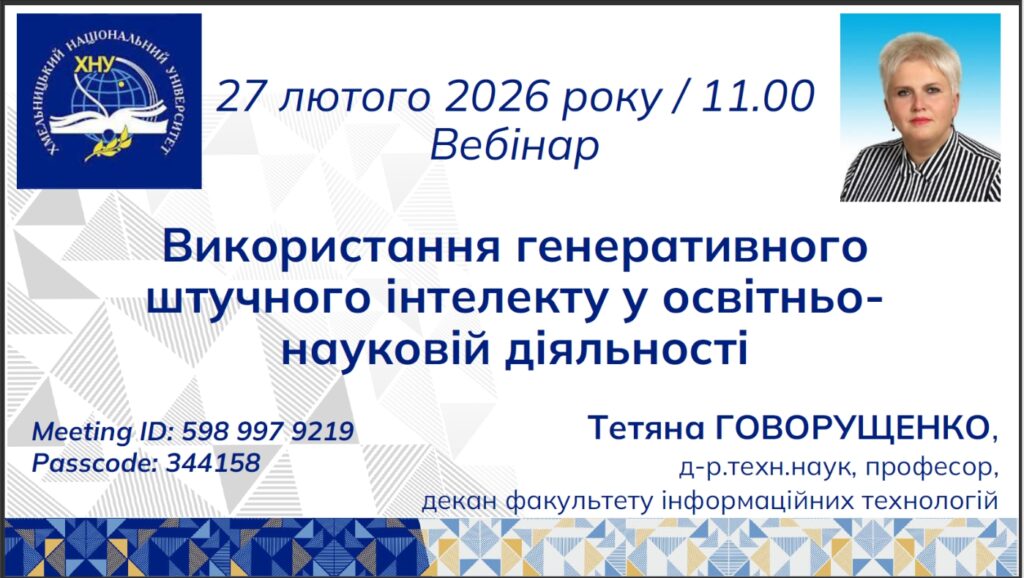 27 лютого 2026 року викладачі кафедри активно підключились до цікавезного заходу – вебінару ВИКОРИСТАННЯ ГЕНЕРАТИВНОГО ШТУЧНОГО ІНТЕЛЕКТУ У ОСВІТНЬО-НАУКОВІЙ ДІЯЛЬНОСТІ.