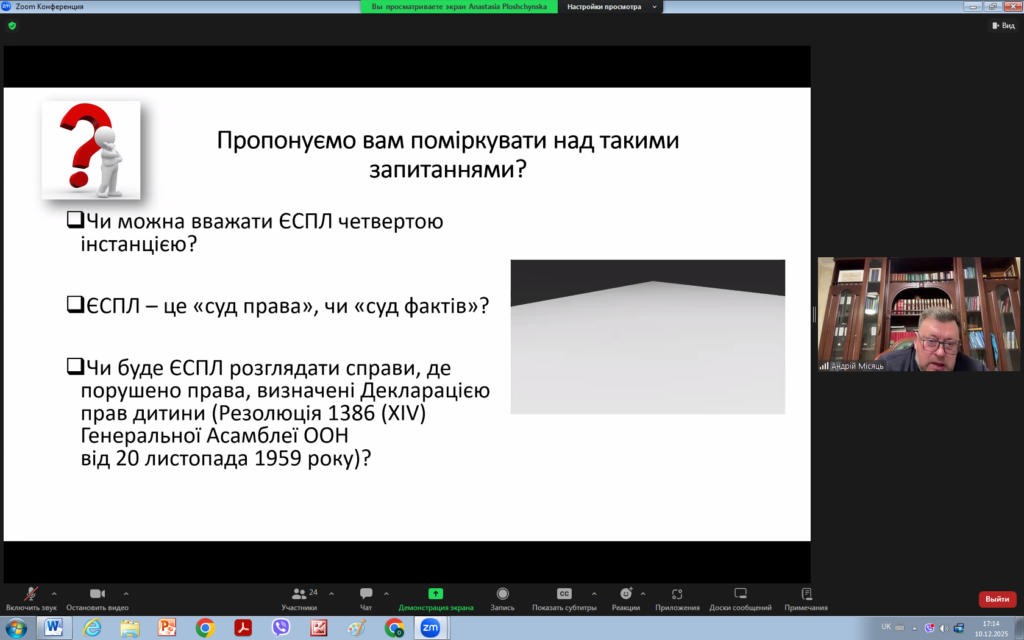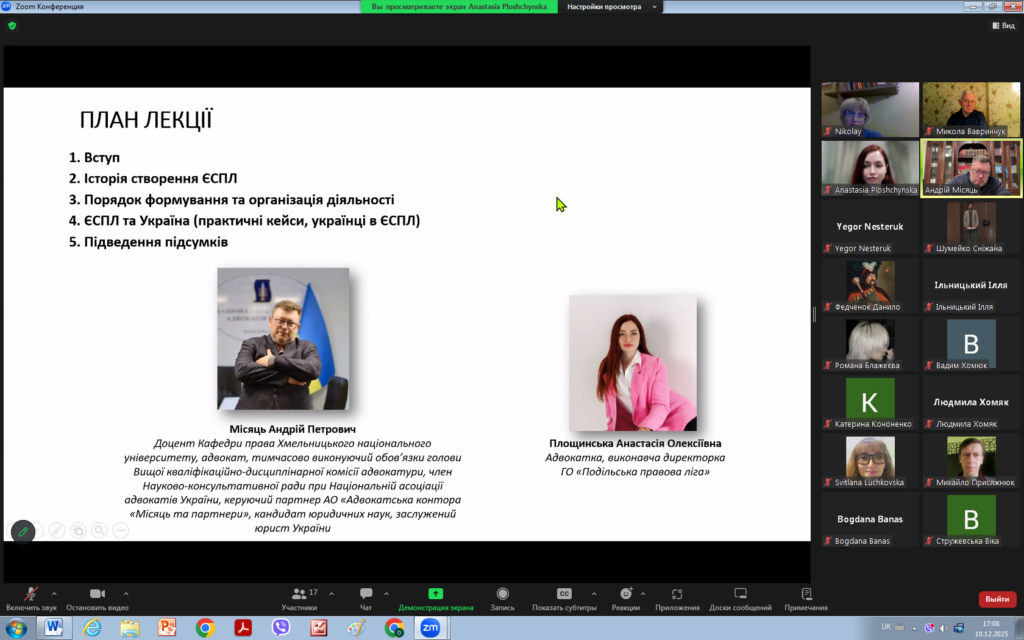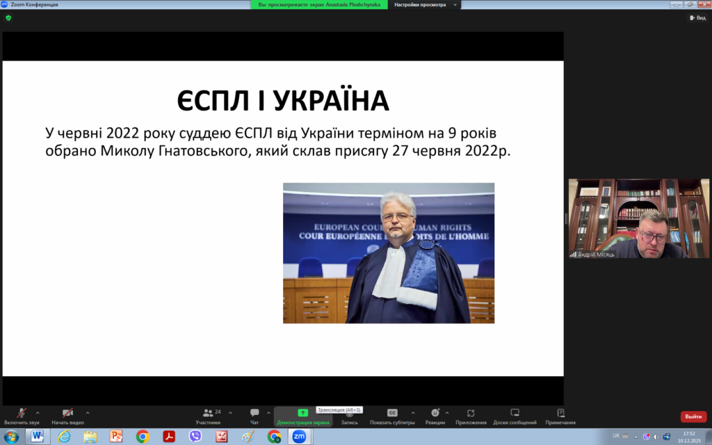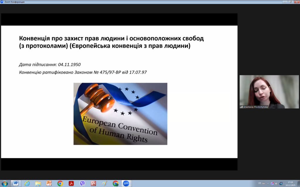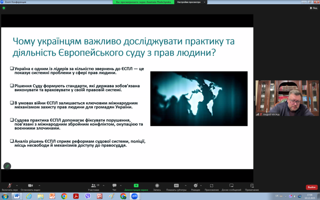 З цієї нагоди 10 грудня 2025 року для викладачів та здобувачів кафедри права було проведено надзвичайно цікавий захід на тему “ЗАГАЛЬНІ ЗАСАДИ ДІЯЛЬНОСТІ ЄВРОПЕЙСЬКОГО СУДУ З ПРАВ ЛЮДИНИ: СУЧАСНИЙ КОНТЕКСТ”. Модераторами заходу виступили доцент кафедри Андрій МІСЯЦЬ та виконавча директорка громадської організації “Подільська правова ліга” Анастасія ПЛОЩИНСЬКА.