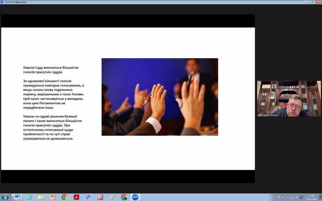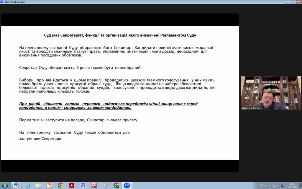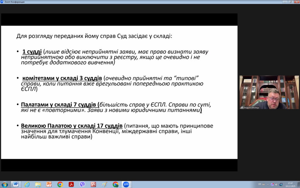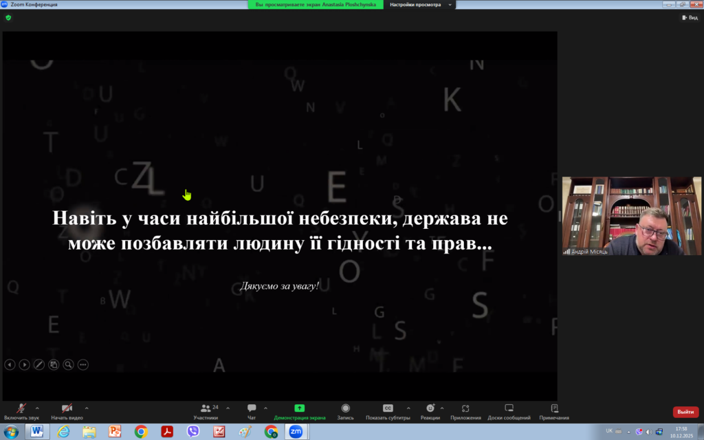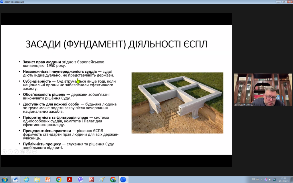 З цієї нагоди 10 грудня 2025 року для викладачів та здобувачів кафедри права було проведено надзвичайно цікавий захід на тему “ЗАГАЛЬНІ ЗАСАДИ ДІЯЛЬНОСТІ ЄВРОПЕЙСЬКОГО СУДУ З ПРАВ ЛЮДИНИ: СУЧАСНИЙ КОНТЕКСТ”. Модераторами заходу виступили доцент кафедри Андрій МІСЯЦЬ та виконавча директорка громадської організації “Подільська правова ліга” Анастасія ПЛОЩИНСЬКА.